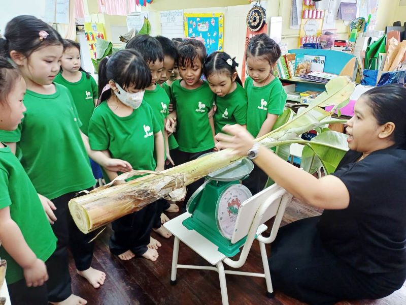 เด็ก ๆ นำลำต้นของต้นกล้วยมาชั่งน้ำหนักบนตาชั่งและสังเกตดูตัวเลข