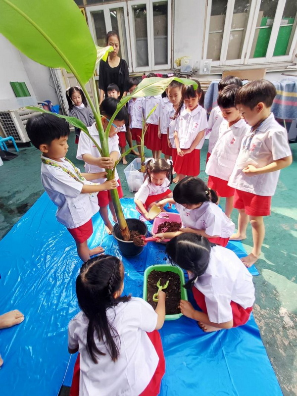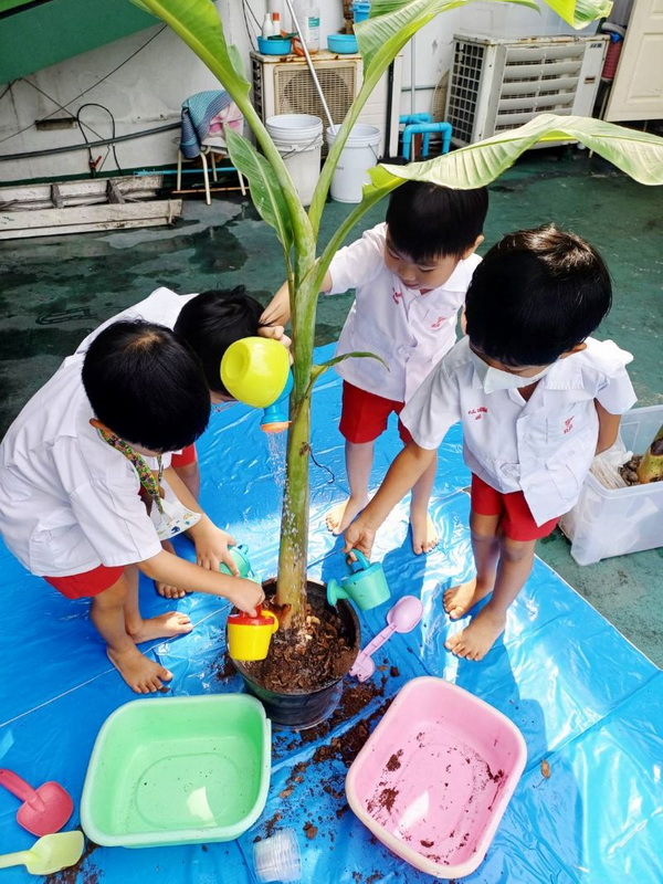 เด็ก ๆ ทดลองปลูกต้นกล้วยจากหน่อกล้วยที่ผู้ปกครองนำมาให้ลงในกระถาง