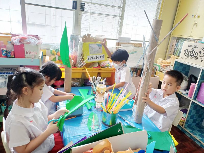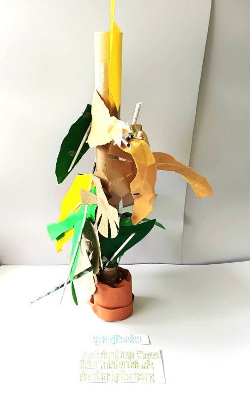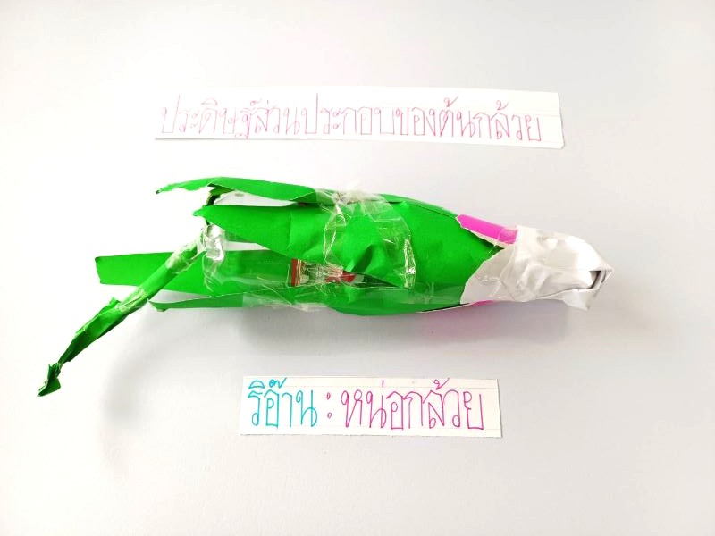 เด็ก ๆ ประดิษฐ์ส่วนประกอบของต้นกล้วยโดยใช้เศษวัสดุ