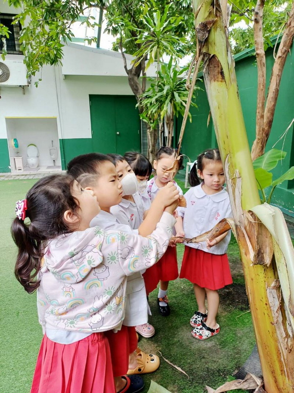 เด็ก ๆ ใช้ประสาทสัมผัสในการสำรวจส่วนประกอบของต้นกล้วยและบอกลักษณะ เช่น ลำต้น กาบกล้วย หยวกกล้วย