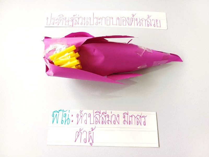 ผลงานการประดิษฐ์ส่วนประกอบของต้นกล้วยโดยใช้เศษวัสดุ พีโน่ : หัวปลีสีม่วง มีเกสรตัวผู้