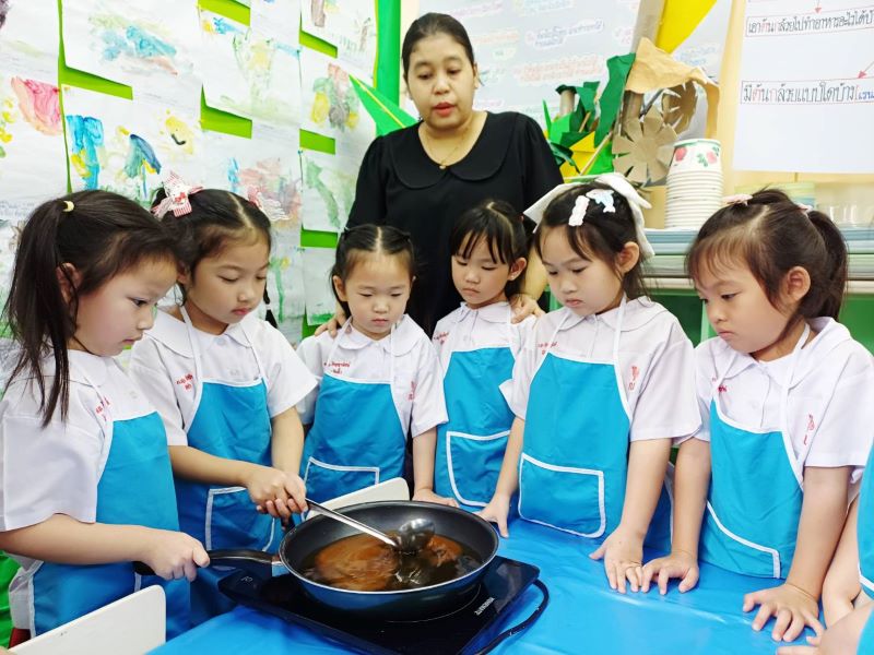 เด็ก ๆ ได้ช่วยกันตวงน้ำเปล่าและน้ำตาลทรายแดงใส่ลงในกระทะ คนให้ละลายและสังเกตสิ่งที่เกิดขึ้น