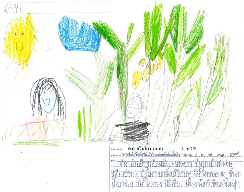 ผลงานการวาดภาพการสืบค้น “ต้นกล้วยมีอะไรบ้าง” จากการสำรวจต้นกล้วยในโรงเรียน อินดี้ : ต้นกล้วยมีรากเป็นเส้นฝอย ๆ อยู่ในดิน มีลำต้นสูงไม่แข็งมาก ลำต้นสีเขียว มีใบตองหลายใบ