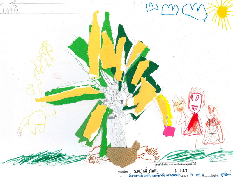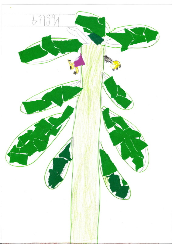 ผลงานการฉีกปะกระดาษเป็นต้นกล้วย ไคลี่ : ต้นกล้วยมีใบใหญ่ ๆ เรียกว่า ใบตอง มีหลายใบ มีใบสีเขียว ใบสีเหลือง คนไปดูกล้วยกับหัวปลี จะเอาไปทำอาหาร