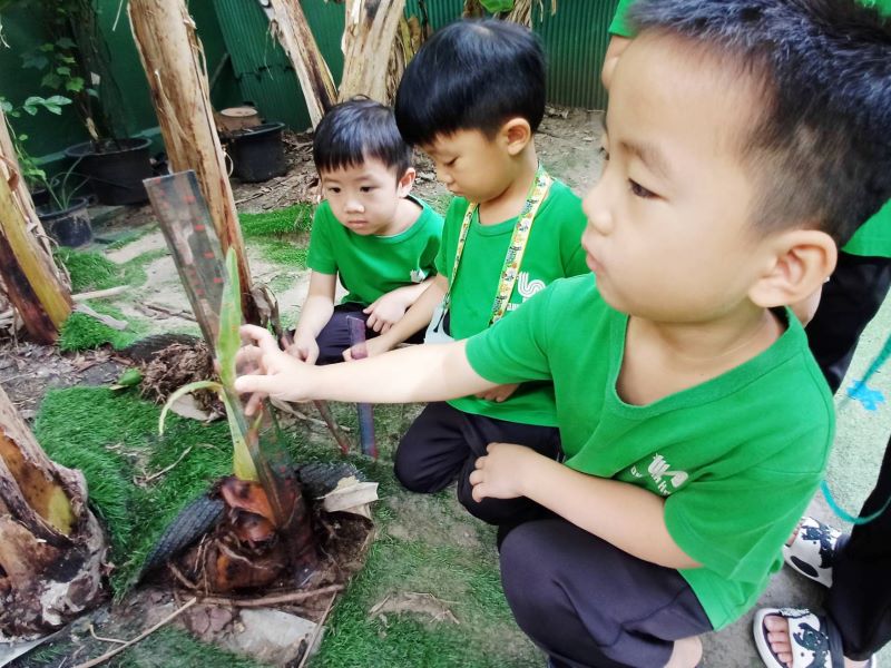 เด็ก ๆ สำรวจ สังเกต ลักษณะของต้นกล้วยน้ำว้าในโรงเรียน
