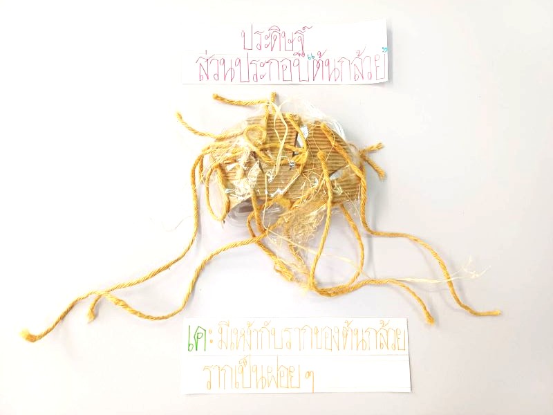 ผลงานการประดิษฐ์ส่วนประกอบของต้นกล้วยโดยใช้เศษวัสดุ เค : มีเหง้ากับรากของต้นกล้วย รากเป็นฝอย ๆ