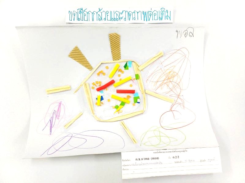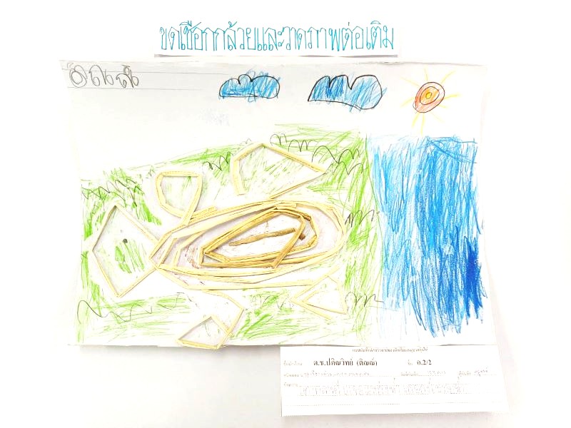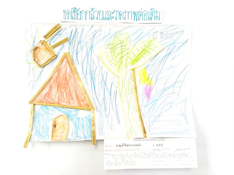 ผลงานการขดเชือกกล้วยและวาดภาพต่อเติม เรนเน่ : หนูปลูกต้นกล้วยไว้ใกล้บ้าน แล้วรดน้ำทุกวัน ต้นกล้วยก็เติบโต
