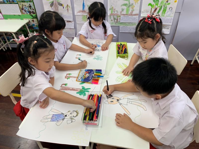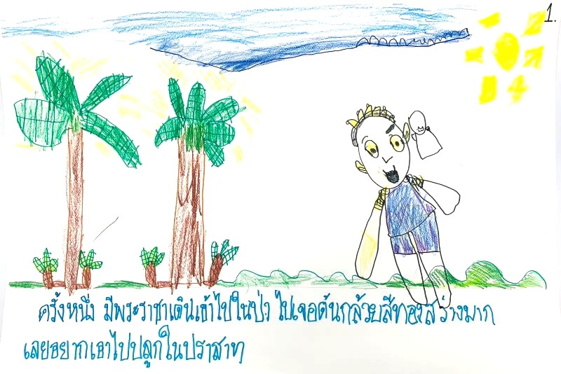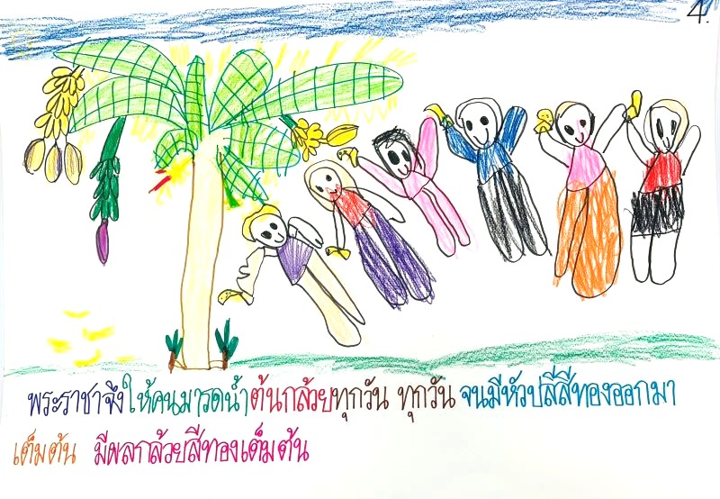 ผลงานการทำนิทานเรื่อง “ต้นกล้วยวิเศษ” พระราชาเปลี่ยนใจไม่ต้องการต้นกล้วยวิเศษไปปลูกในปราสาทแล้ว แต่ให้ต้นกล้วยวิเศษอยู่ในป่า ให้คนมาเก็บไปปลูก เอาไปกินเป็นอาหารได้ตลอดไป