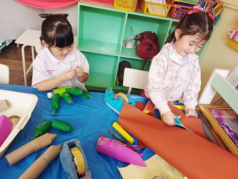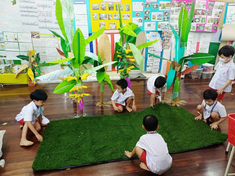 ผลงานการจำลองสวนกล้วยโดยใช้วัสดุและเศษวัสดุ เกรท : ต้นกล้วยอยู่ในสวน มีใบตอง เวลาเอามาห่อขนมเรียกว่าใบตอง
