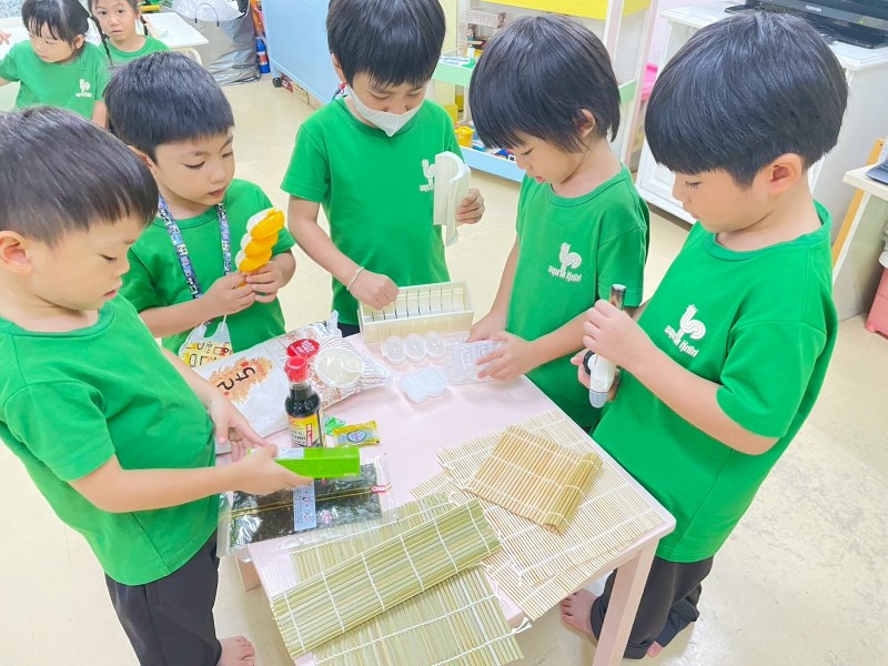 รมณกำลังอธิบายเกี่ยวกับสาหร่ายที่ใช้ในการทำซูชิให้เพื่อน ๆ ฟัง