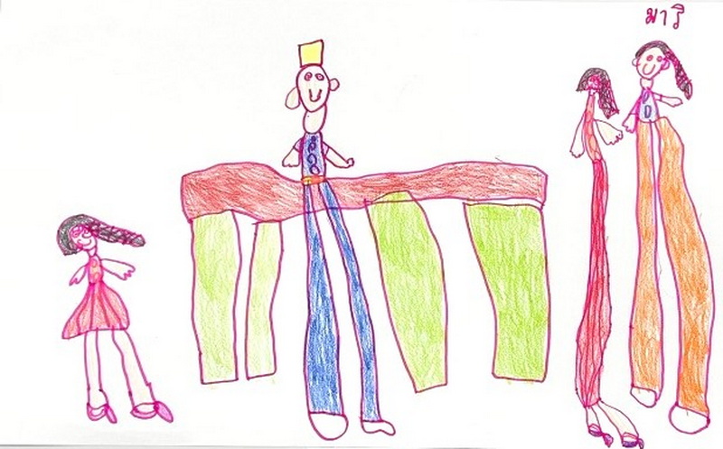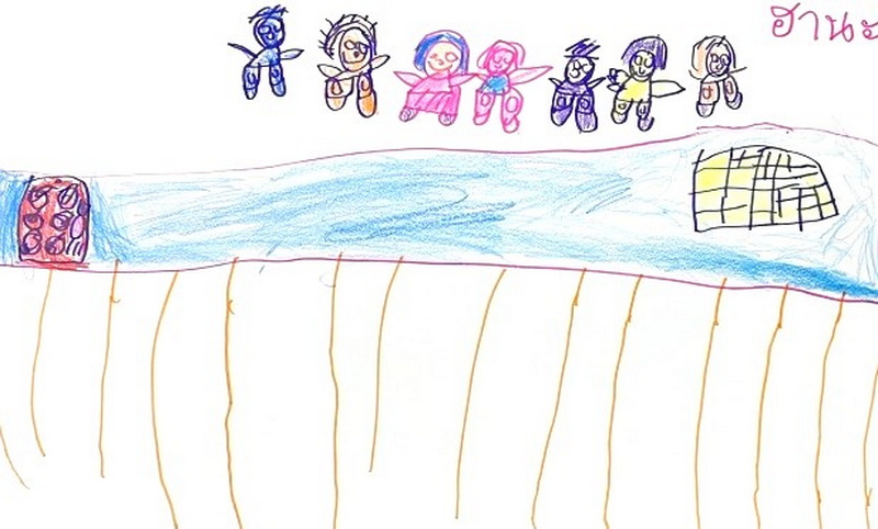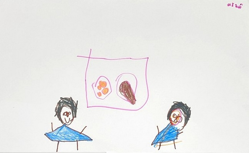ผลงานการวาดภาพสะท้อนการเรียนรู้ รมณ : รมณกับเพื่อน ๆ กำลังเอาซูชิใส่ไปในตู้เย็นดูว่าซูชิมันเป็นอย่างไร