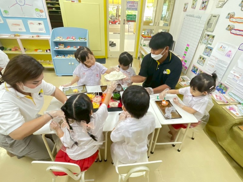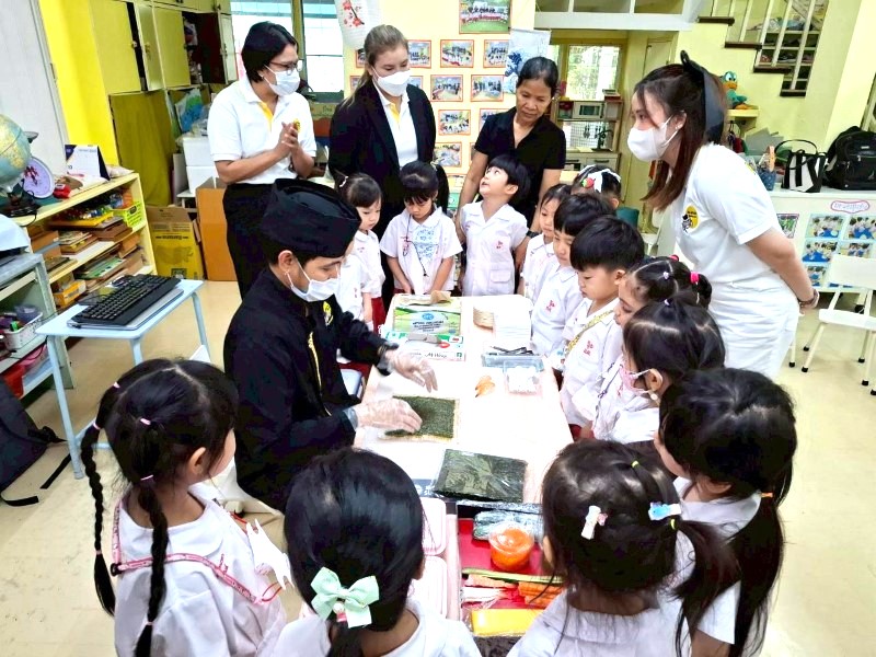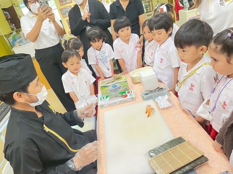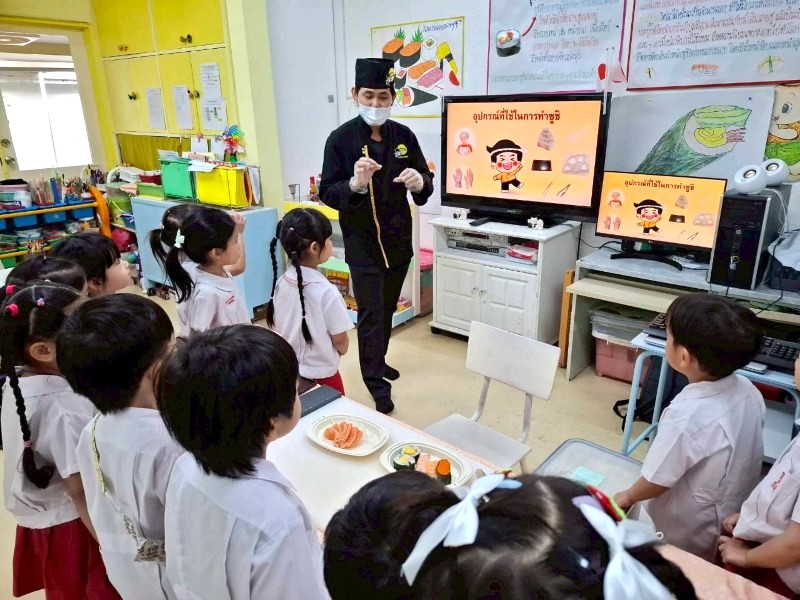เชฟกำลังให้คำแนะนำเด็ก ๆ ระหว่างทำซูชิ
