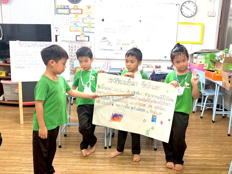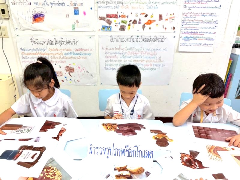 เด็ก ๆ ผลัดกันนำข้อมูลเกี่ยวกับช็อกโกแลตจากที่บ้านออกมาเล่าให้เพื่อน ๆ ฟัง