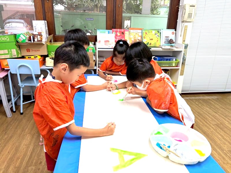 เด็ก ๆ ช่วยกันระบายสีป้าย Project Approach เพื่อนำไปติดที่หน้าห้องเรียน