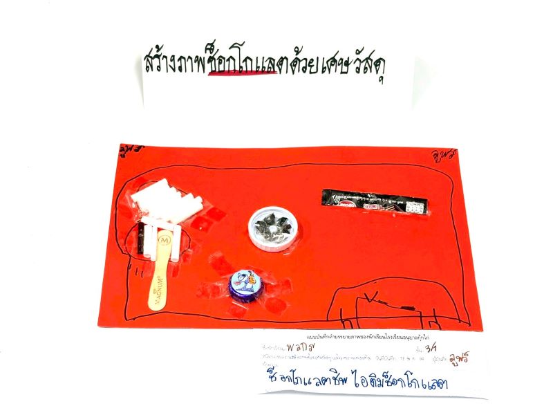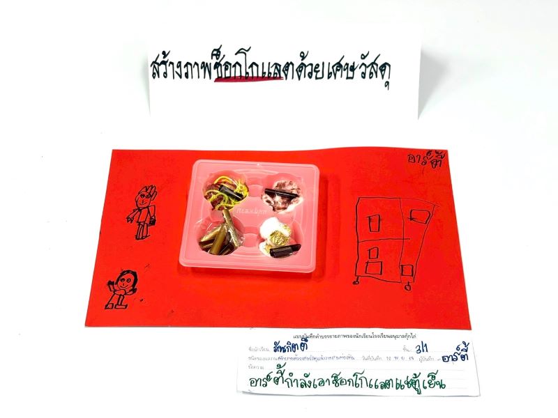ผลงานสร้างภาพด้วยเศษวัสดุแล้ววาดภาพต่อเติม อาร์ตี้ : อาร์ตี้กำลังเอาช็อกโกแลตแช่ตู้เย็น
