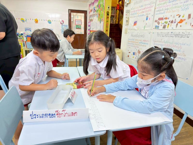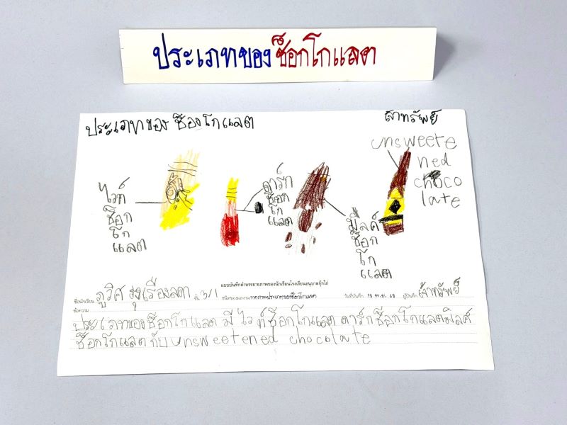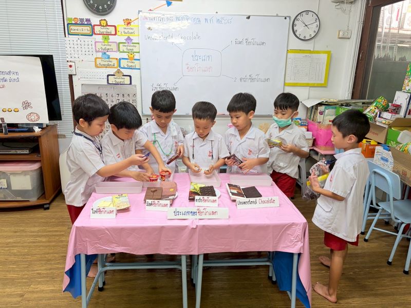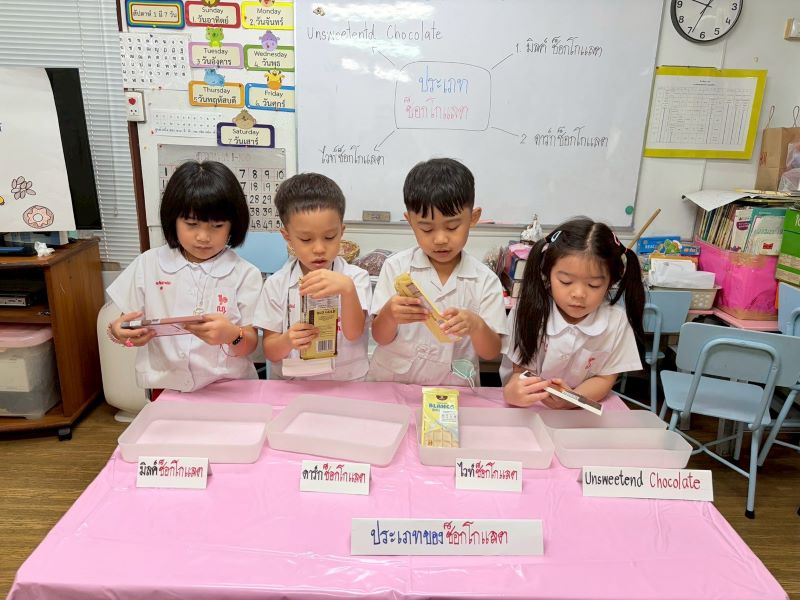 เด็ก ๆ ได้นำช็อกโกแลตจากที่บ้านมาแยกประเภทว่าอยู่ในประเภท มิลค์ช็อกโกแลต ไวท์ช็อกโกแลต ดาร์กช็อกโกแลต หรือ Unsweetened Chocolate