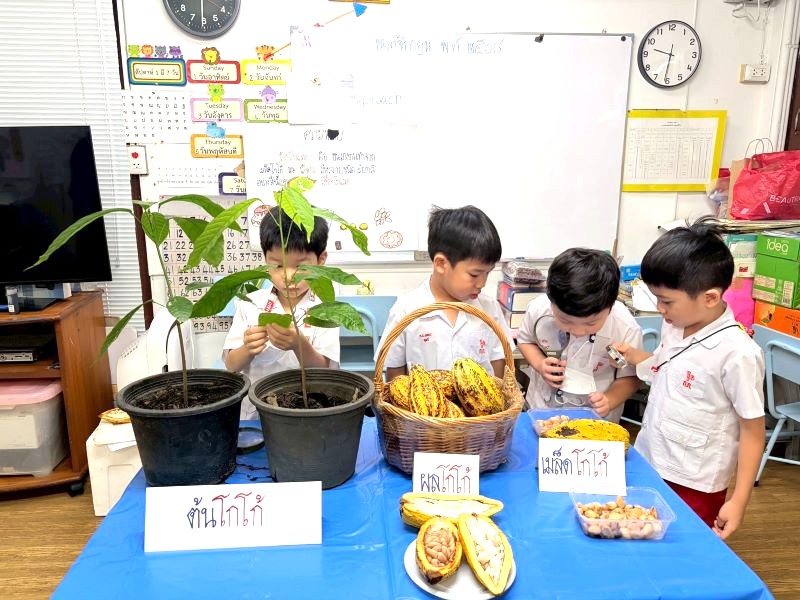 สืบเนื่องจากที่เด็ก ๆ สงสัยว่าช็อกโกแลตมาจากต้นอะไร ครูได้นำต้นอ่อนโกโก้ ผลดิบ ผลสุก และเมล็ดมาพูดคุยกับเด็ก ๆ