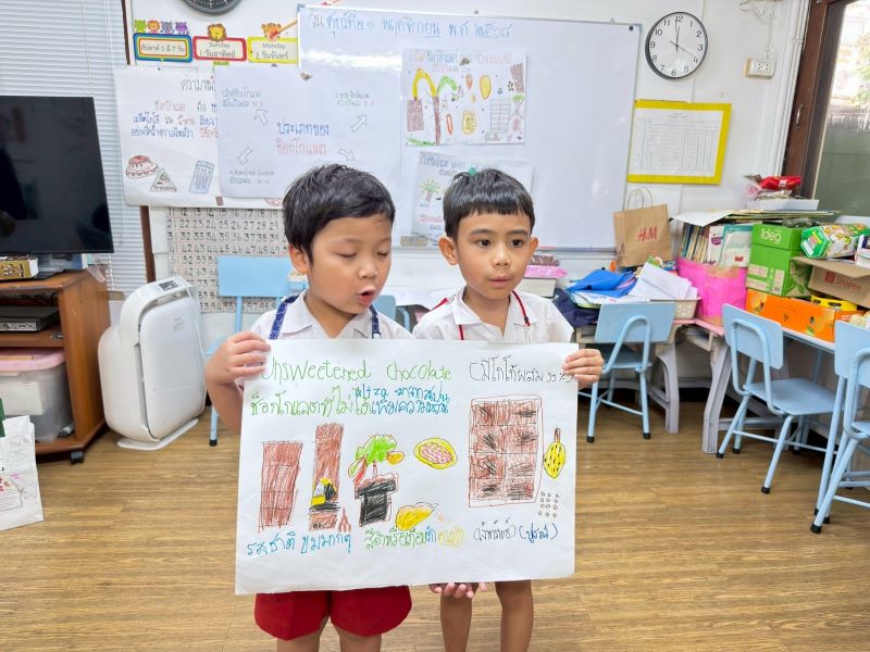 ปูรณ์และเจ้าทรัพย์ออกมานำเสนอ เกี่ยวกับ ช็อกโกแลตประเภท “Unsweetened Chocolate” ให้เพื่อน ๆ และครูทราบอีกครั้ง