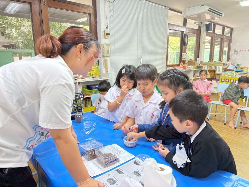 เด็ก ๆ ได้ลองชิมรสชาติของโกโก้นิบส์ที่ช่วยกันกระเทาะแยกเปลือกออก แล้วบอกได้ว่าโกโก้นิบส์มีรสชาติและเป็นเป็นอย่างไร