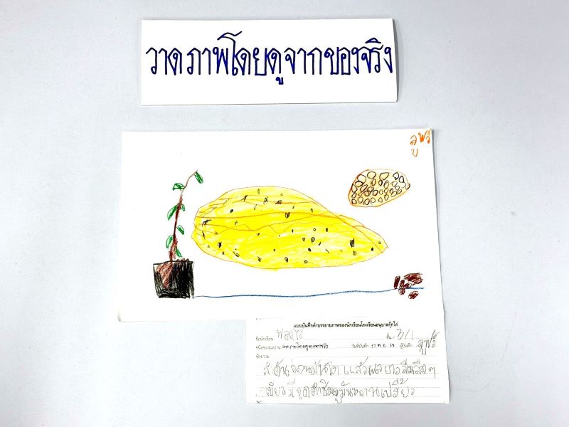 ผลงานวาดภาพต้นอ่อนโกโก้ ผล และเมล็ด ลูฟว์ : ลำต้นอ่อนมันโต และผลยาวสีเหลือง ๆ สีเขียวมีจุดดำชิมดูมันหวานเปรี้ยว