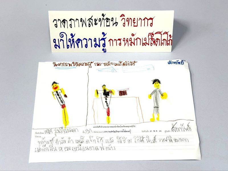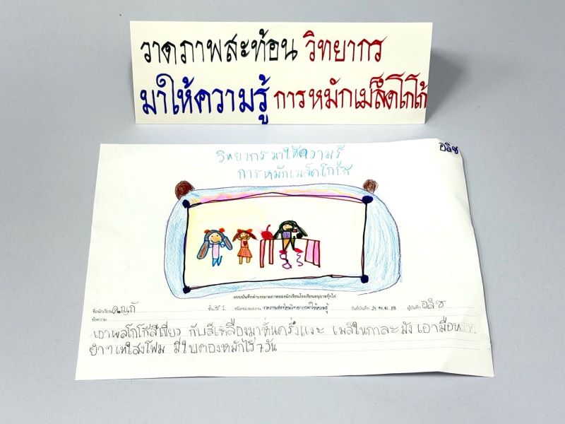 ผลงานวาดภาพสะท้อนวิทยากรมาให้ความรู้ เอมมี่ : หนูหั่นผลโกโก้เอาเมล็ดตักใส่กะละมังขยำใช้มือเอาไปใส่กล่องโฟมทิ้งไว้ 7 วัน
