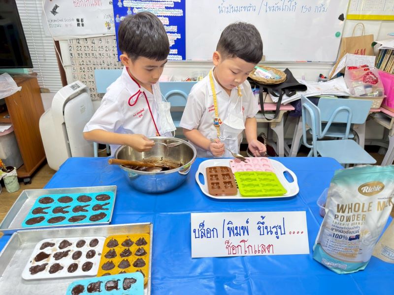 เด็ก ๆ ผลัดกันออกมาหยอดช็อกโกแลตลงบล็อก/พิมพ์ ขึ้นรูปช็อกโกแลต