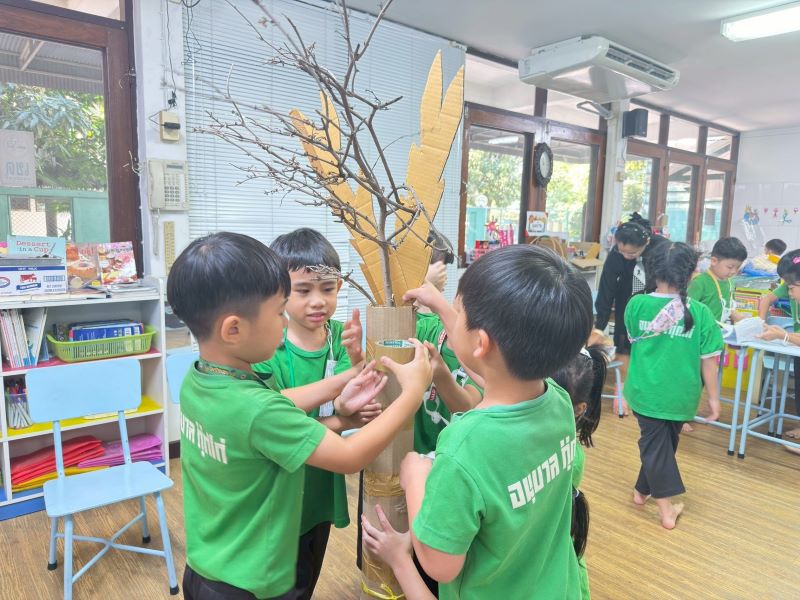 เด็ก ๆ คิดจำลองต้นโกโก้ เลือกใช้วัสดุต่าง ๆ ได้แก่ ลังกระดาษ กิ่งไม้ ครูช่วยจัดหาอุปกรณ์ให้