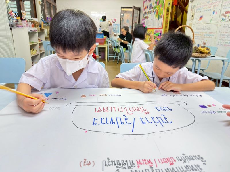 เด็ก ๆ ผลัดกันออกมาคนส่วนผสมต่าง ๆ ให้เข้ากันโดยมีครูดูแลอย่างใกล้ชิด
