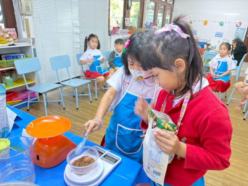 อาร์ตี้และปุณณ์กำลังตวงเนยโกโก้ 150 กรัม โดยสังเกตตัวเลขบนหน้าปัดตาชั่ง
