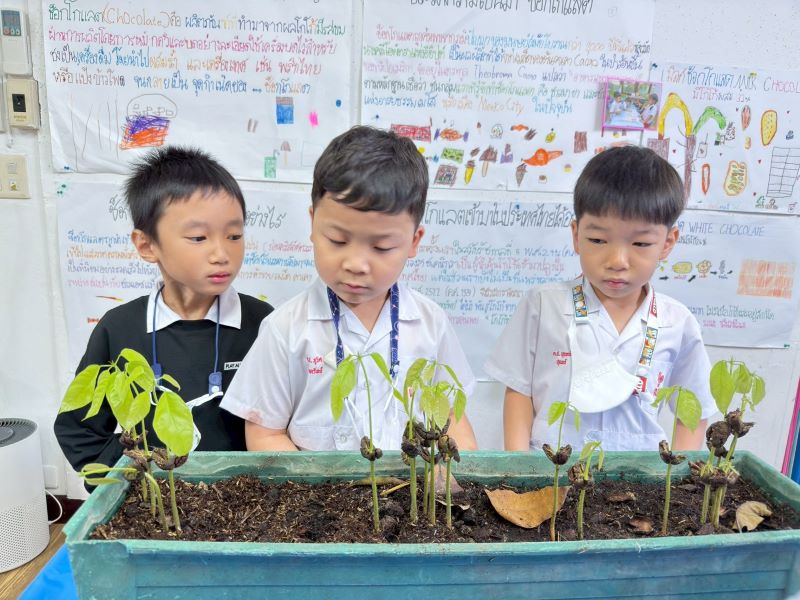 เด็ก ๆ สำรวจ สังเกต ต้นโกโก้ที่ช่วยกันปลูกจากเมล็ดโกโก้และพูดคุยถึงการเปลี่ยนแปลงที่เกิดขึ้น