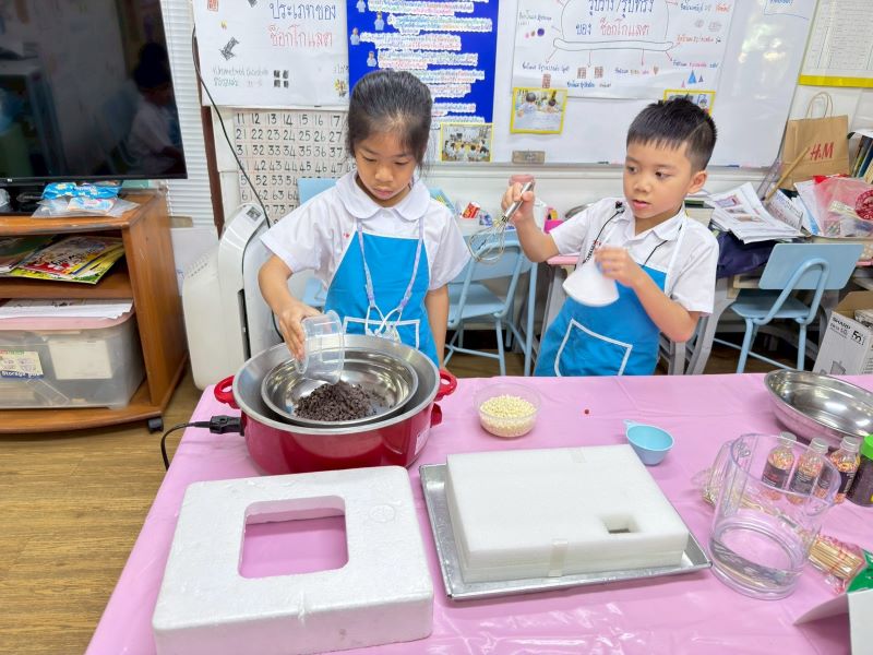 ระหว่างรอให้ช็อกบอลแข็งตัว เด็ก ๆ ละลายมิลค์ช็อกโกแลต และไวท์ช็อกโกแลตเตรียมไว้