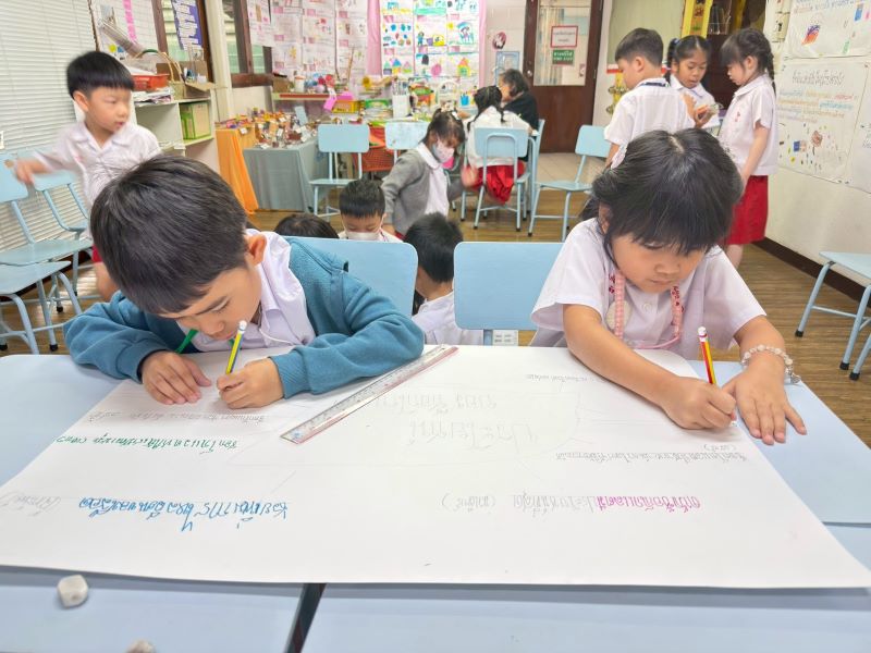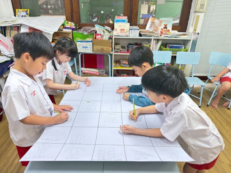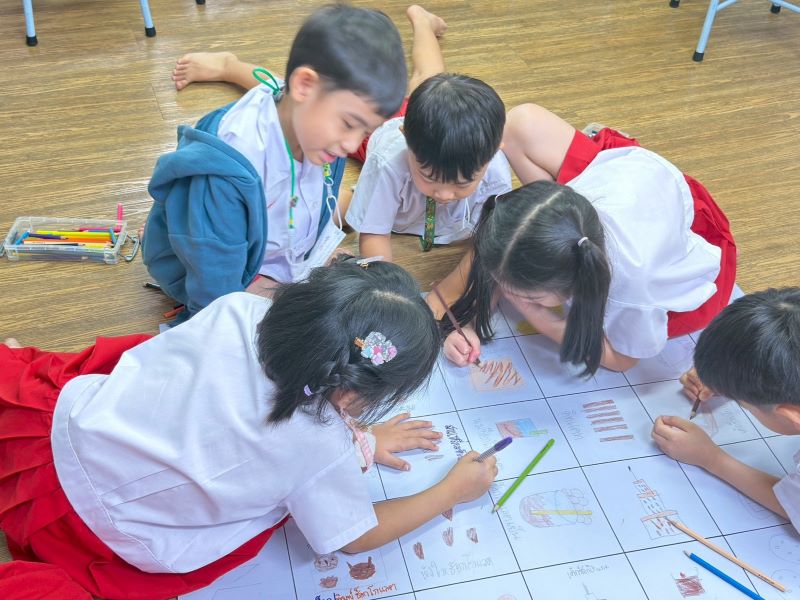 เด็กช่วยกันวาดภาพระบายสีตกแต่ง chart ที่สรุปร่วมกัน