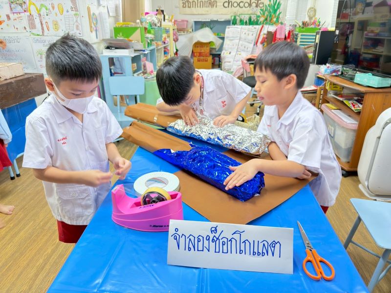เด็ก ๆ ผลัดกันออกมาแสดงความคิดเห็นว่า นอกจากช็อกโกแลตจะเอาไปทำขนมแล้ว ช็อกโกแลตยังสามารถนำไปทำอะไรได้อีกบ้าง