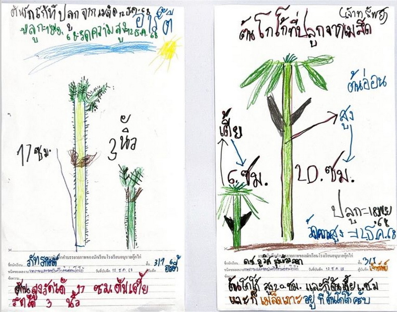ผลงานการวาดภาพ จดบันทึก และวัดความสูงของต้นโกโก้ ลูฟว์ : ลูฟว์วัดต้นโกโก้ได้สูง 6 นิ้ว ธาร : ต้นสูง 20 ซม. ต้นเตี้ย 3 ซม.