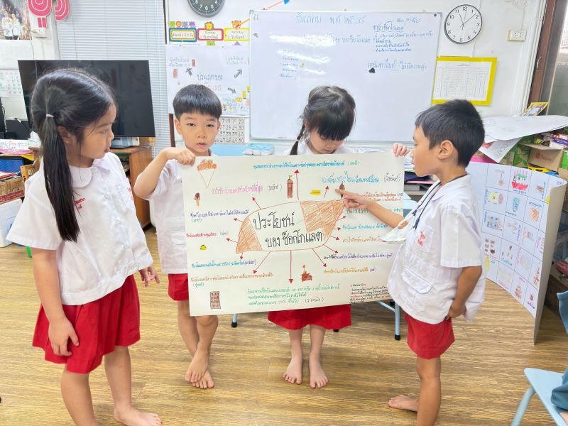 หลังจากสืบค้นข้อมูลแล้ว เด็ก ๆ ผลัดกันออกมาเขียนสรุปลงบน chart เกี่ยวกับประโยชน์ของช็อกโกแลตคนละ 1 ข้อ