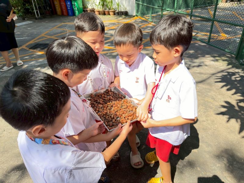 เด็ก ๆ ผลัดกันออกมาสำรวจเมล็ดโกโก้ที่ตากแดดผ่านไปแล้ว 3 วัน พูดคุยเปรียบเทียบกัน ก่อนตากแดดและหลังตากแดด