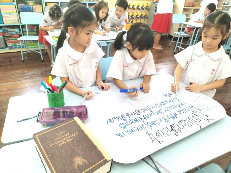 เด็กช่วยกันคิดหาคำและเขียนคำที่มีตัวพยัญชนะต้น ด.ไดโนเสาร์