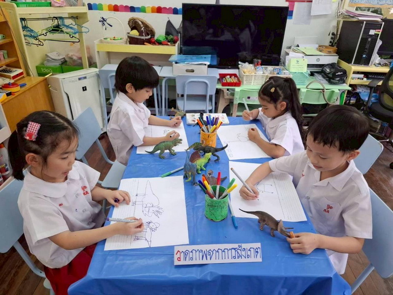 เด็ก ๆ กำลังวาดภาพจากการสังเกต “ไดโนเสาร์” ด้วยสีไม้