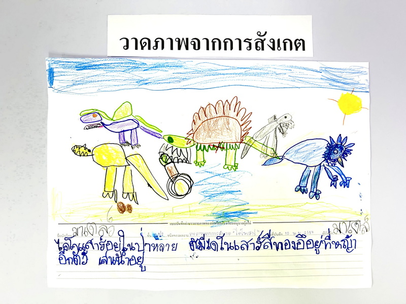 ผลงานวาดภาพจากการสังเกต “ไดโนเสาร์” ธาม : ในหนังสือมีไดโนเสาร์คอยาวมี T- Rex มันเดิน 2 ขา มีขาหน้าเล็ก ๆ เห็นไดโนเสาร์ที่มีหนามแหลม