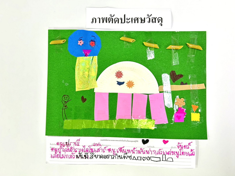 ผลงานภาพตัดปะเศษวัสดุเพื่อประกอบเป็น “ไดโนเสาร์” จันทร์ : หนูกำลังสำรวจไดโนเสาร์ หนูเห็นหน้ามันน่ากลัว แต่หนูโตแล้วเลยไม่กลัว มันมีสี่ขา คอยาว กินพืช