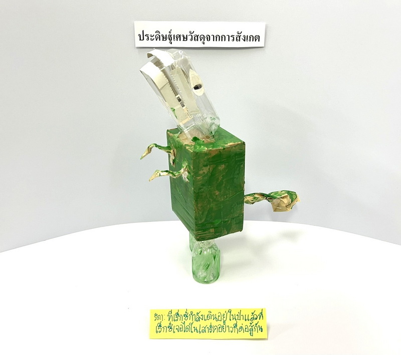 ผลงานงประดิษฐ์เศษวัสดุเป็น “ไดโนเสาร์” ตังค์ตังค์ : ไดโนเสาร์สีเขียวกำลังเดินเล่น