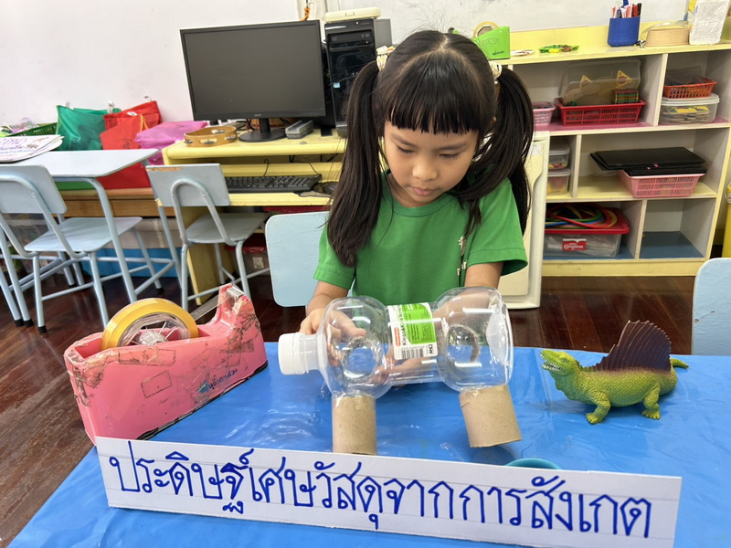 ตังค์ตังค์กำลังประดิษฐ์เศษวัสดุเป็น “ไดโนเสาร์”