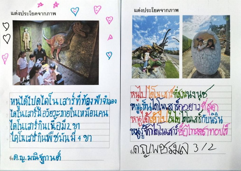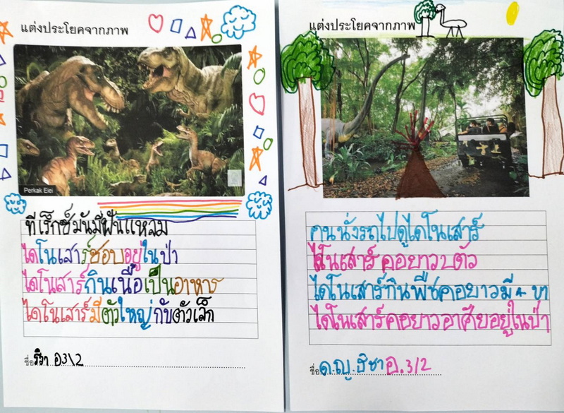 ผลงานแต่งประโยคจากภาพ ริตา : หนูได้ไปดูไดโนเสาร์ที่ท้องฟ้าจำลอง ไดโนเสาร์มีอวัยวะภายในเหมือนคน ไดโนเสาร์กินเนื้อมี 2 ขา ไดโนเสาร์กินพืชมันมี 4 ขา ตังค์ตังค์ : หนูไปดูไดโนเสาร์ที่สวนนงนุช หนูเห็นไดโนเสาร์คอยาวที่สุด หนูได้เข้าไปในไข่ไดโนเสาร์กับนิริน หนูรู้จักไดโนเสาร์ชื่อไทรเซราทอปส์