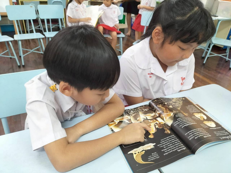 ครูนำหนังสือเกี่ยวกับการเกิดจากไข่ของไดโนเสาร์มาเล่าให้เด็ก ๆฟัง