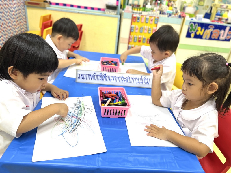ผลงานวาดภาพด้วยสีเทียนจากประสบการณ์เดิม คริช : มีรถตำรวจอยู่ที่บ้าน คุณแม่ซื้อให้คริช มีแสงสีแดง สีฟ้า อยู่ข้างบนรถ